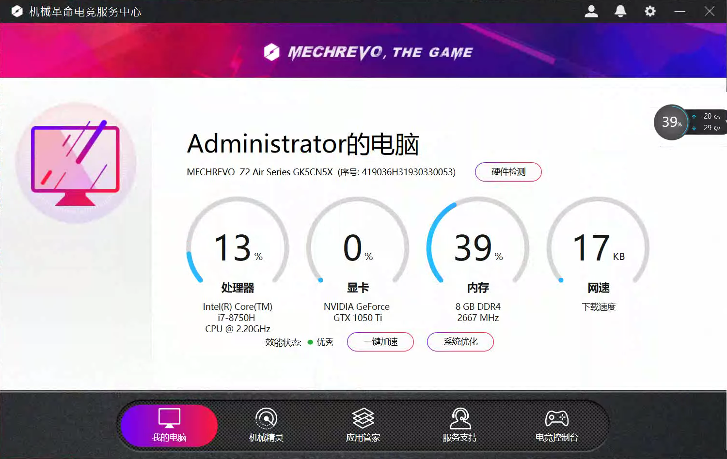 - 安装完成后,即可使用旧版本的机械革命电竞服务中心。