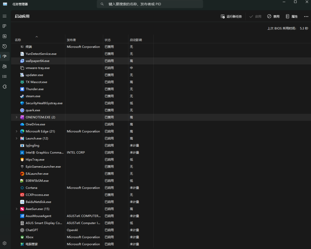 - 策略:重点关注“启动影响”为“高”的非核心进程。对于不知名的第三方应用,建议直接 Disable。