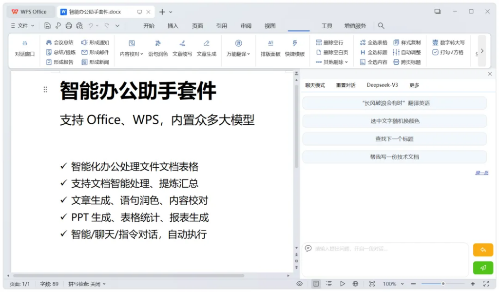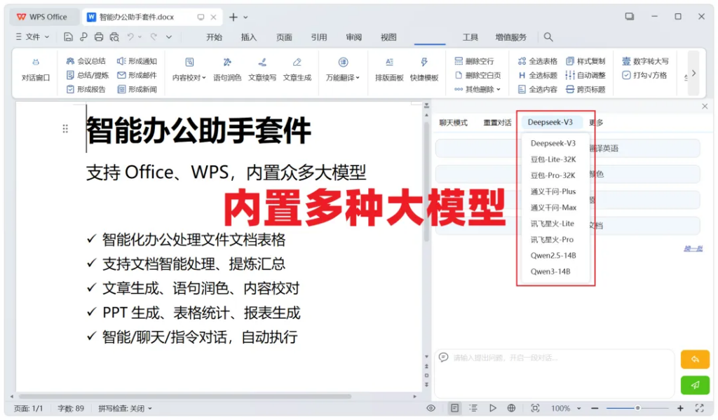 它可以对Office、WPS各类文档表格,进行大模型智能化处理: