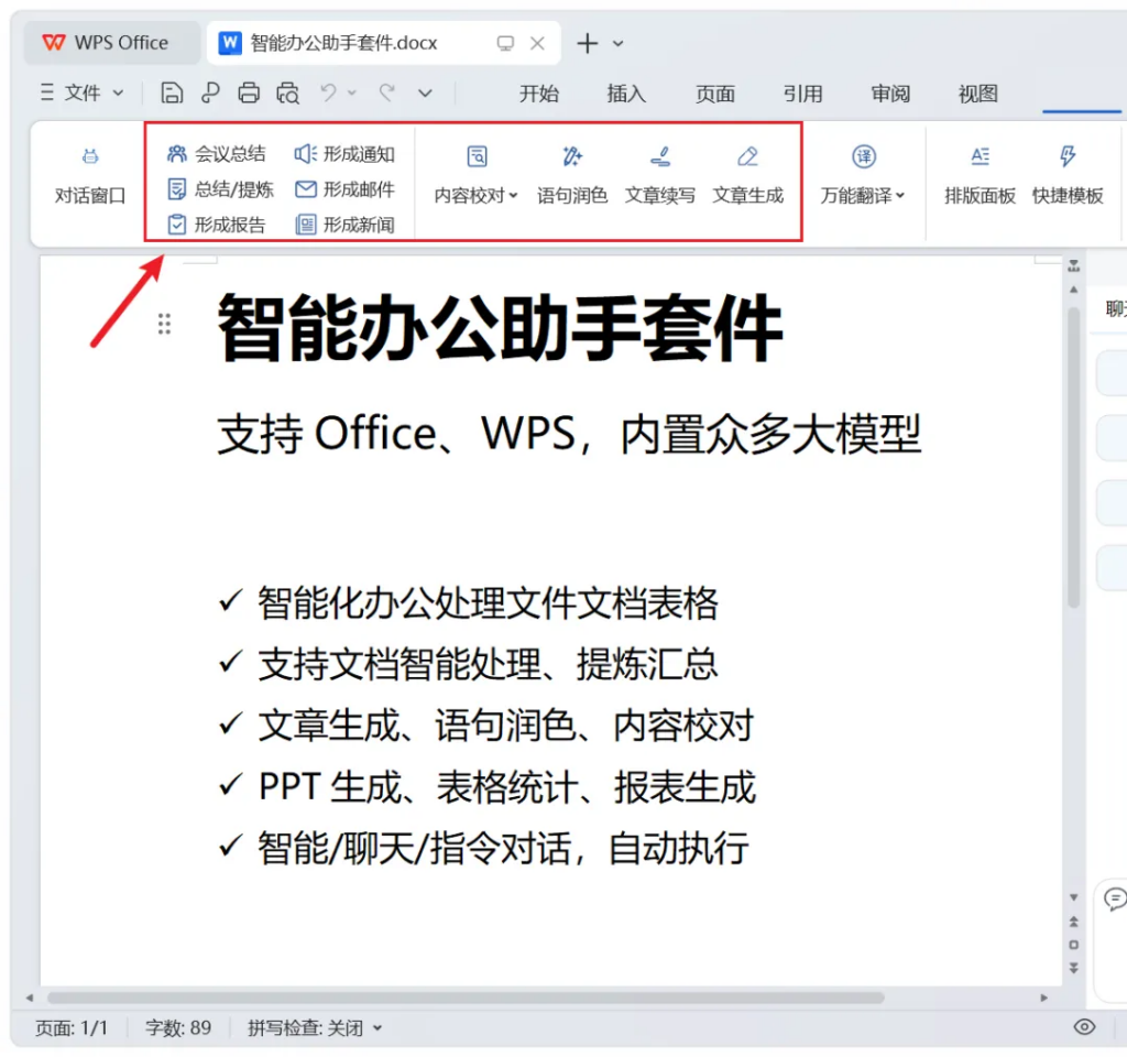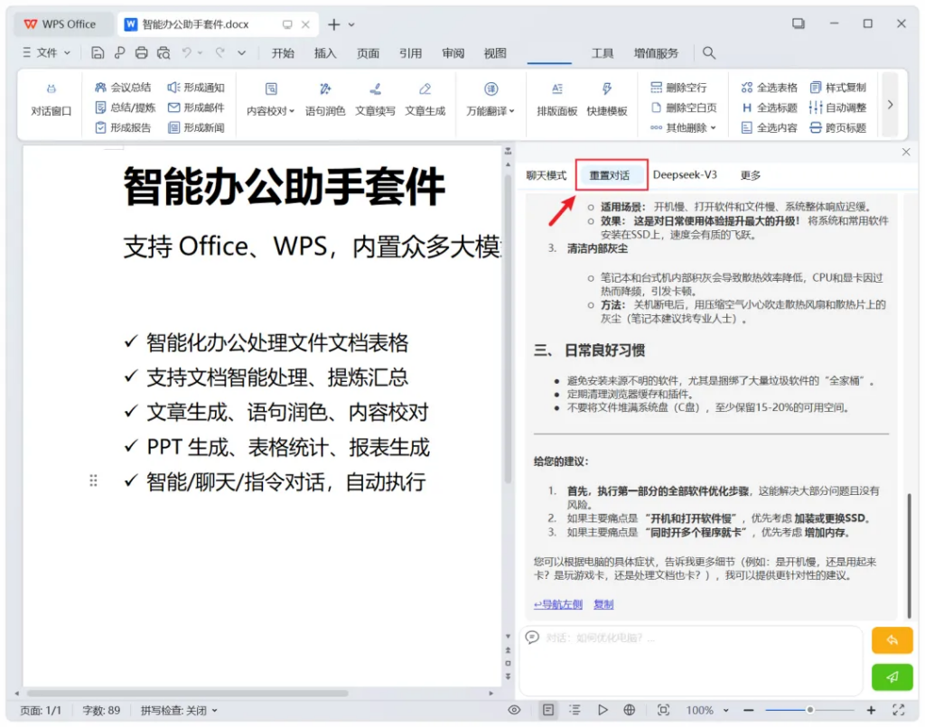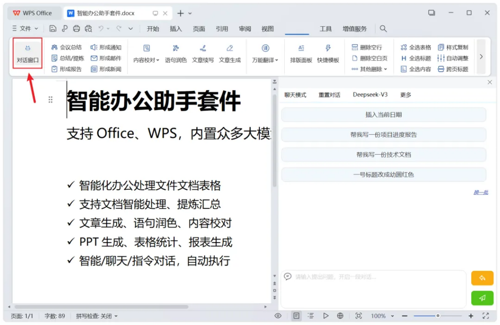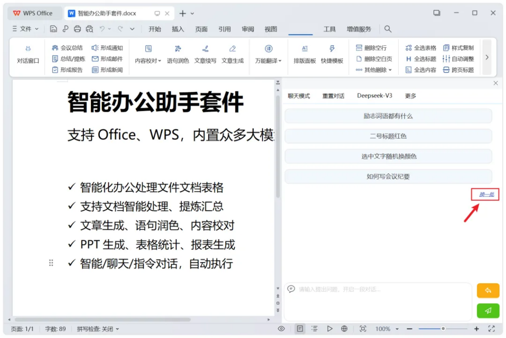左侧,也能开启对话窗口,等于是在办公文档中,内嵌了智能助手功能: