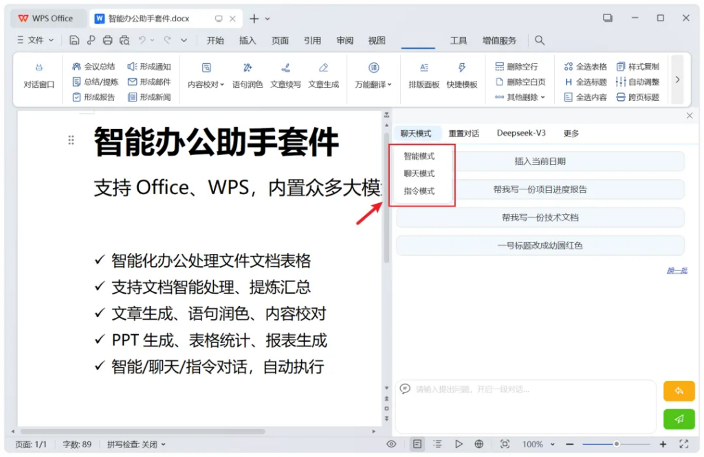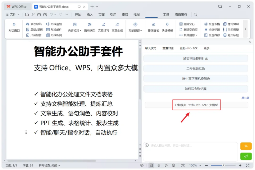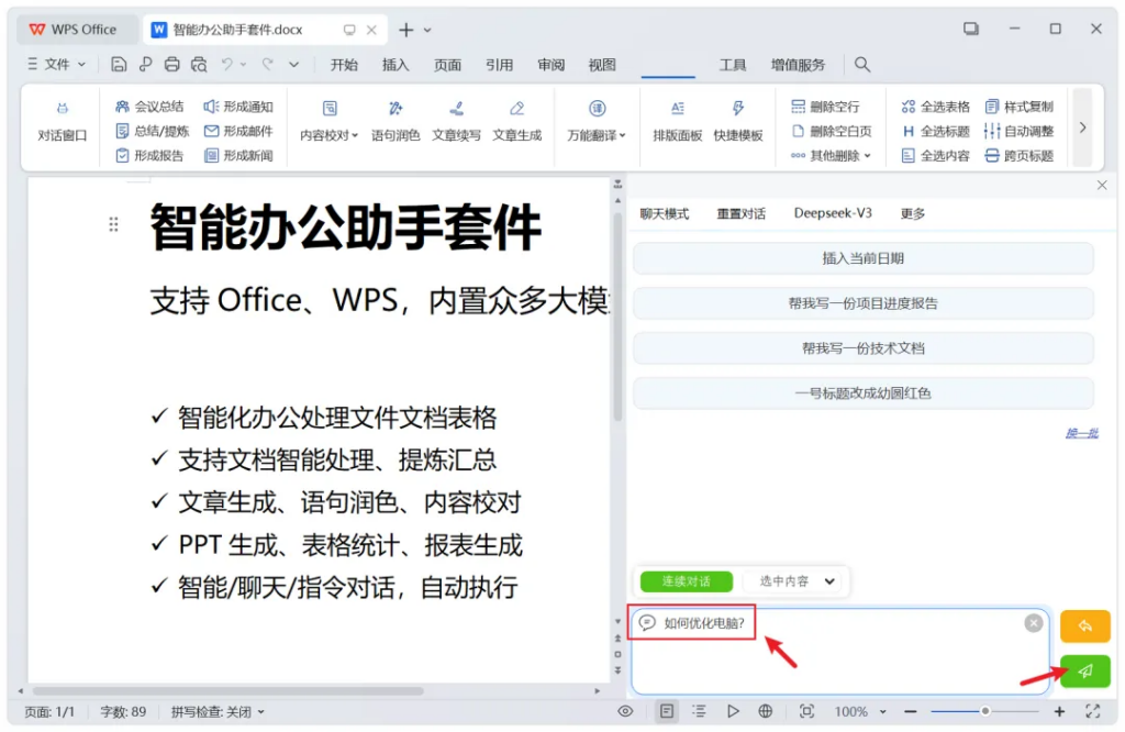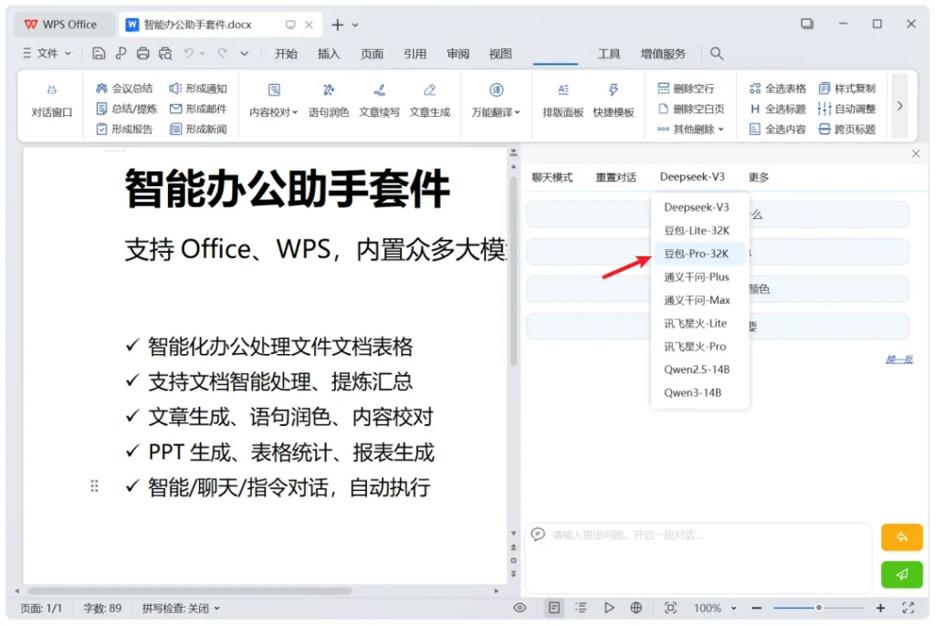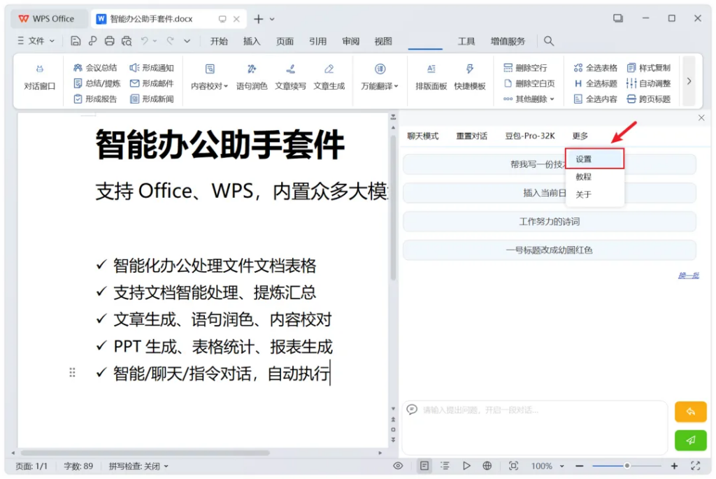 左侧,也能开启对话窗口,等于是在办公文档中,内嵌了智能助手功能: