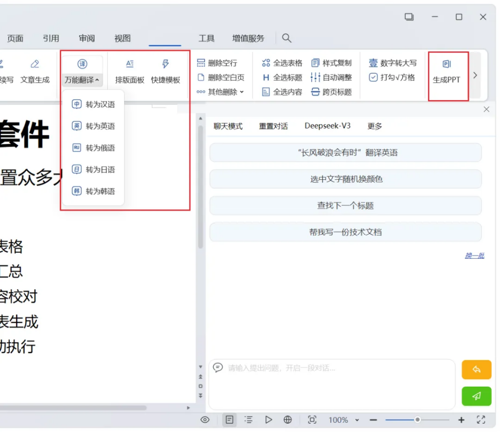 多语种翻译、一键排版、PPT生成等:
