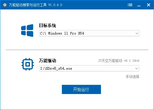 说明:指定后程序仅加载此目标系统并搜索万能驱动,可与上述两个参数一起使用,例如:RunWanDrv.exe OSDriver=C:\ /Auto