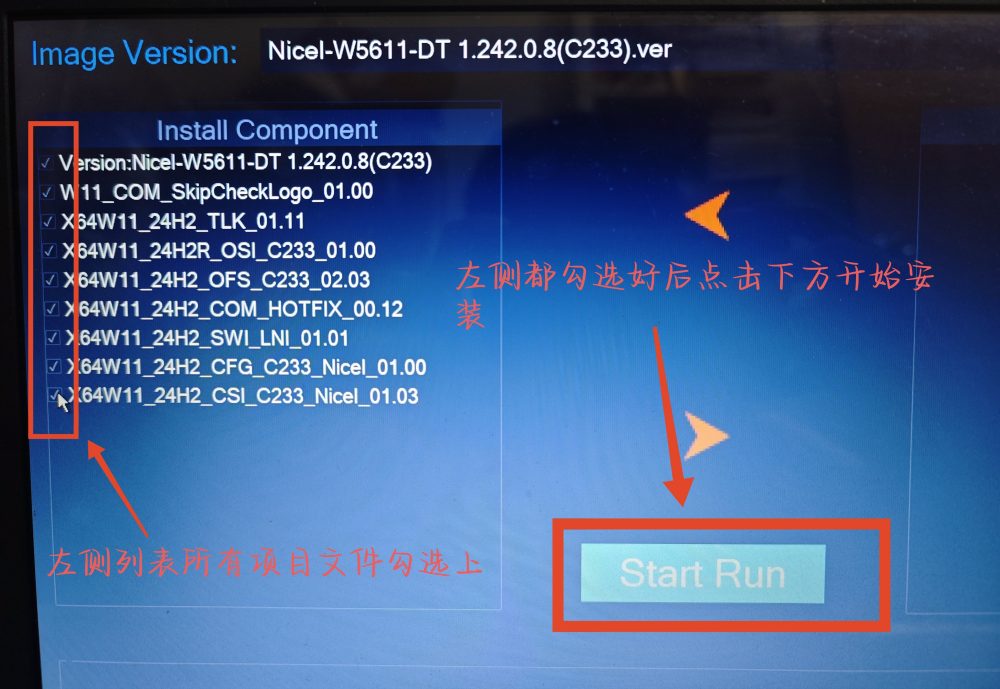5. 出现左侧列表项目文件之后全部都勾选上,确认无误后点击下方Start Run开始安装